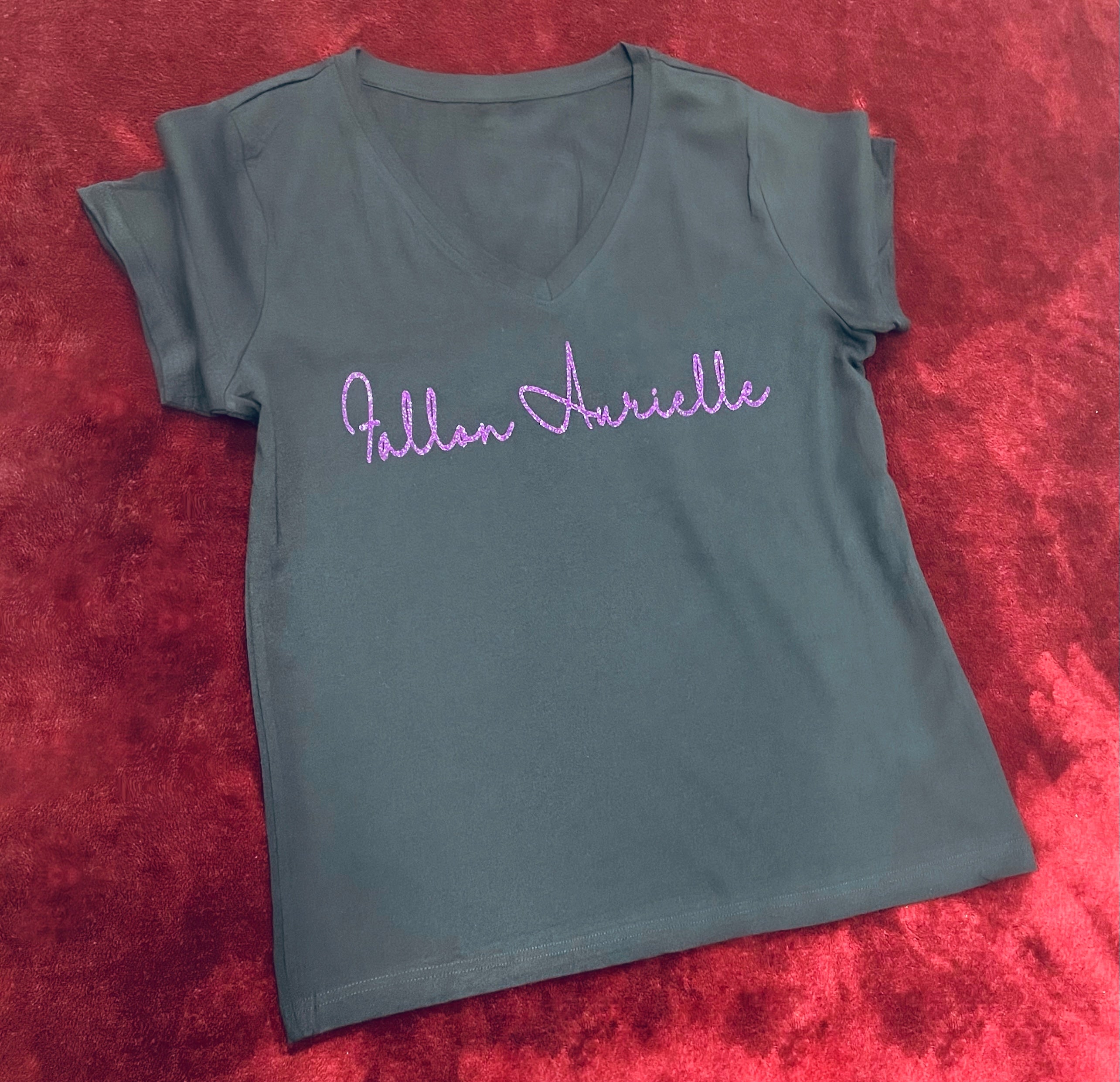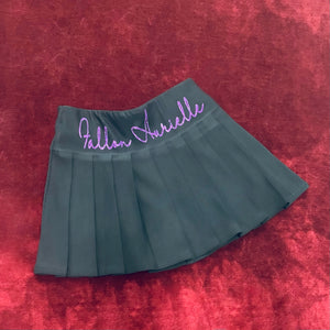 The “Fallon Aurielle Signature Classic V-Neck 3 Piece Tennis Skirt Set” is for the around the way girl who loves to be stylish, unique and super fly. We love the versatility in these pieces. You can wear killer high heels, boots, booties and sneakers. The options are absolutely endless. Purple sparkle cursive name detail in center of adjustable Visor Hat, t-shirt and across front waistband on skirt. Super stretchy & comfortable fabric. Fits true to size. View size chart for details.