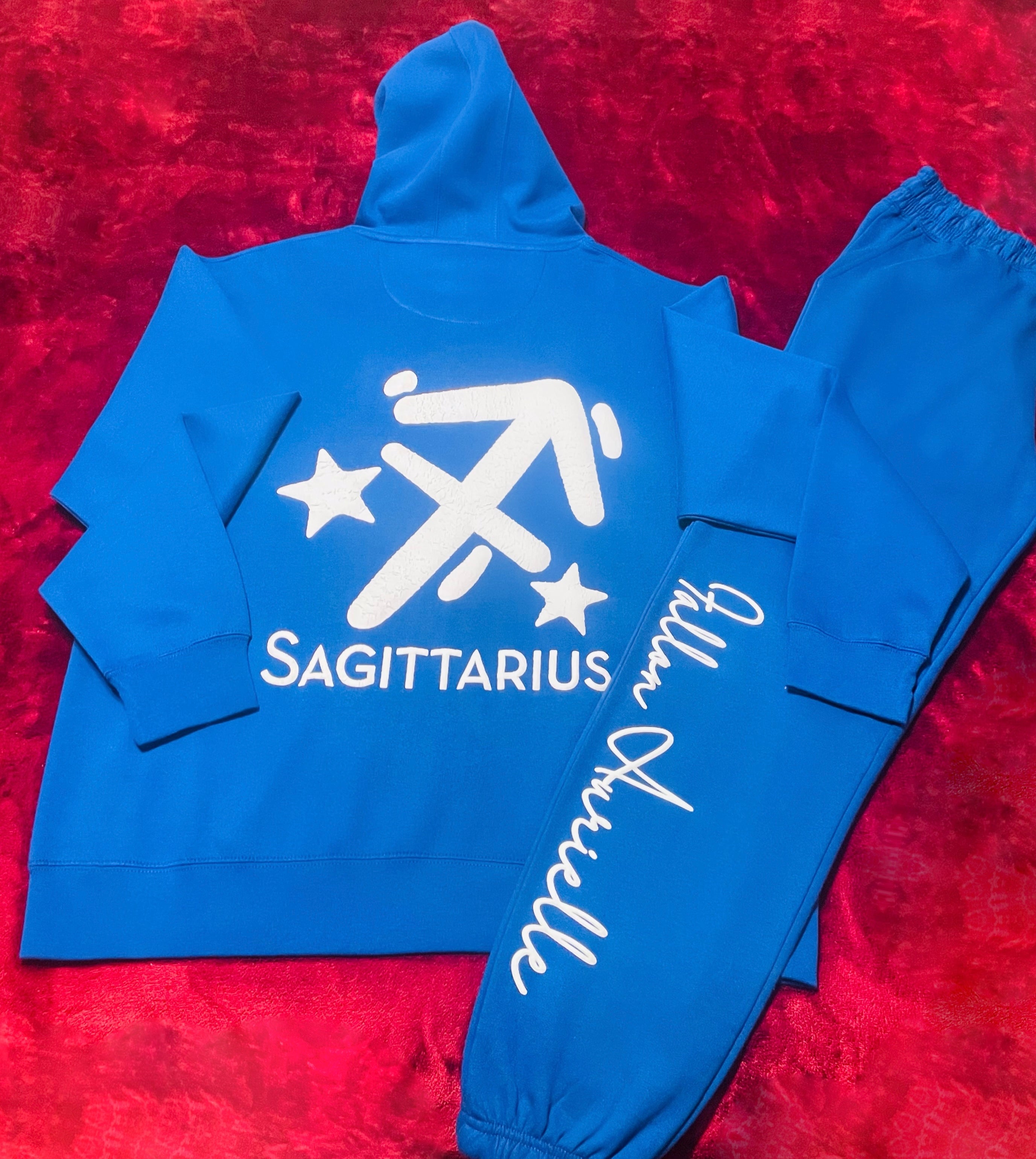 The “Fallon Aurielle Unisex Signature Sagittarius Logo & Name Zodiac Jogging Set” is for the around the way guy or girl who loves to be stylish, unique and super fly. We love the versatility in these 2 pieces. You can wear killer high heels, boots, booties and sneakers. The options are absolutely endless. White cursive Fallon Aurielle name in front center of hoodie, Sagittarius symbol on back and full name Fallon Aurielle down right leg of joggers. Drawstring waist & side hand pockets. Fits true to size. View size chart for details.