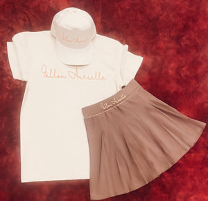 The “Fallon Aurielle Signature Classic 3 Piece Tennis Skirt Set” is for the around the way girl who loves to be stylish, unique and super fly. We love the versatility in these pieces. You can wear killer high heels, boots, booties and sneakers. The options are absolutely endless. Tan cursive name detail in center of adjustable Trucker Hat, t-shirt and across front waistband on skirt. Super stretchy & comfortable fabric. Fits true to size. View size chart for details.